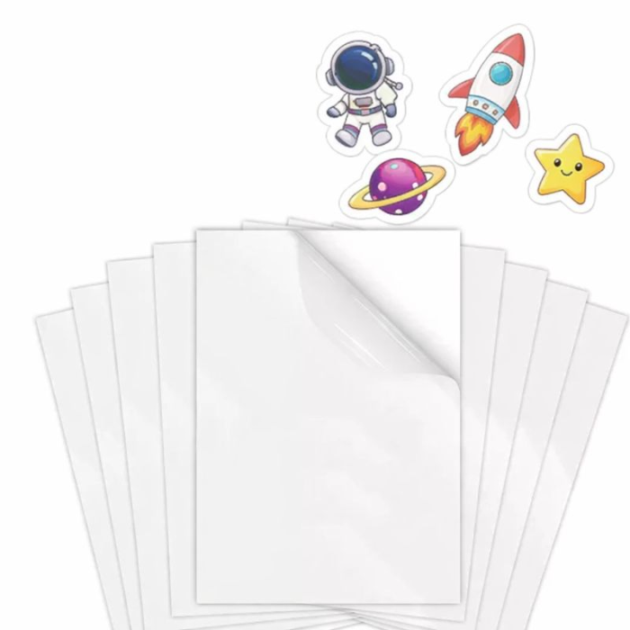 Autocolantul este din vinil adeziv, dimeniune 210 x 297 mm, textură mată, rezoluţie maximă 5760 dpi, grosime vinil 200 microni + liner din hârtie siliconată de 100g/mp,